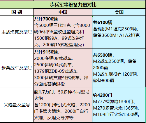 从坦克、步兵战车、火炮来说,中国陆军部队在装备上的规模几乎是美军的两倍,在质量上与美军不相上下,双方是各有优势,美国在陆军的优势体现在装备先进的陆军航空兵上。