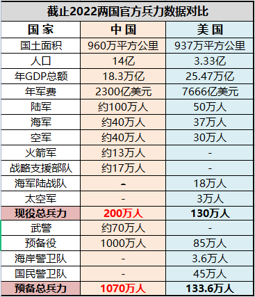 在此补充一点:有很多数据说美军有180万人,实际上是算了和中国武警或民兵同级的警卫队数字进去了,按照这个算法中国军队加武警能达到270万了,但中国兵力要求一直都在200万上下,所以武警不算在这里的,有战事这个总数就会随时变化了。