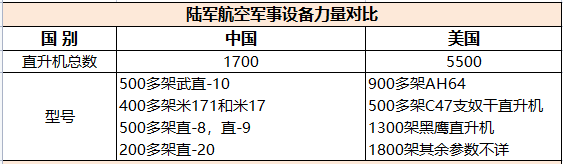 通过数据对比,很明显可以看出美国陆军航空兵的装备质量和规模都要强于中国陆军航空兵