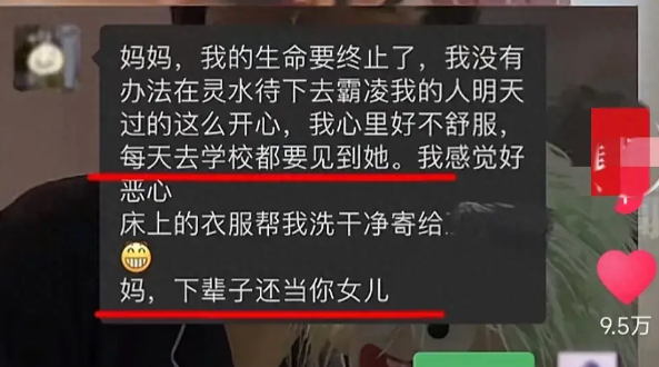 "妈妈,我的生命要终止了,我没有办法在灵水待下去霸凌我的人每天过得这么开心,我心里好不舒服,每天去学校都要见到她。我感觉好恶心。床上的衣服帮我洗干净寄给……"
