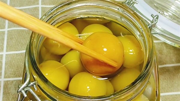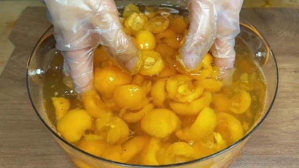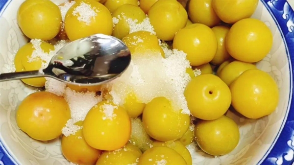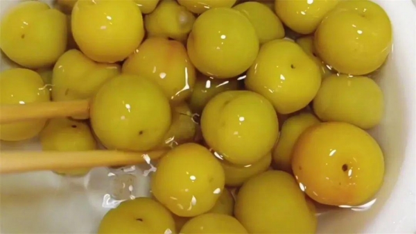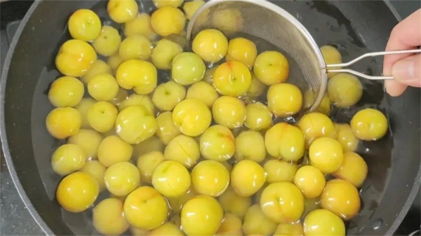 4、15分钟后,李子的颜色变得金黄,再把捞起来放入装有冰水的盆里,这一步可以使腌出来的李子更加脆爽。