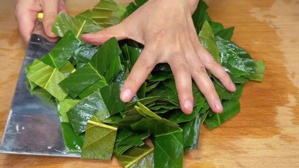 3、准备1斤枇杷叶,用刷子洗去表面的绒毛,再用清水洗干净,然后改刀切成小段,方便煮出汁水,放一旁备用。