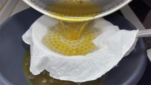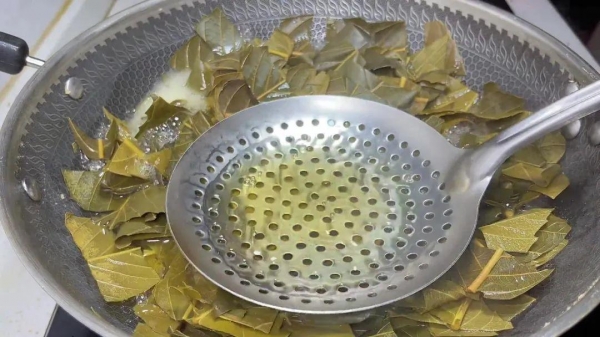 7、时间到后,枇杷叶已经变黄,汁水的颜色越浓越好,再将叶子捞出来,把煮出来的汁水过滤一遍,去掉里面的杂质。