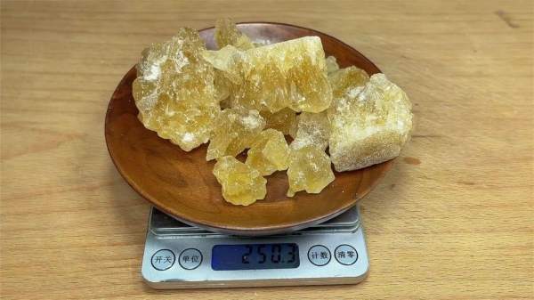 5、再准备适量的冰糖,冰糖最好选择黄冰糖,按照比例,3斤枇杷只需要半斤冰糖就可以了,太大块可以敲碎。