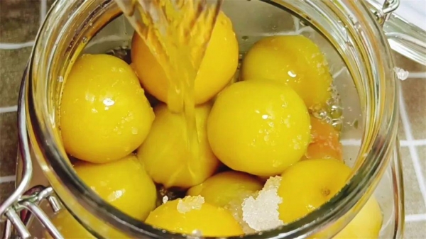 6、15分钟后,把李子装入无水无油的罐子,未完全融化的白糖也放下来,然后加入适量的凉开水,没过李子,盖上盖子密封起来。
