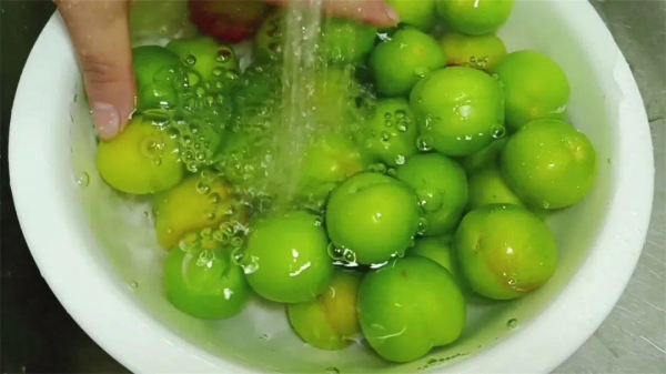 2、时间到后,把李子轻轻地搓洗一下,再放入另一个盆里,用流动的清水将李子洗干净,再装入大点的盆里。