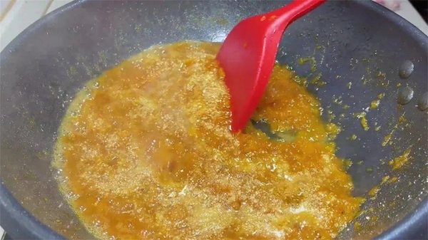 9、期间打开盖子,用铲子把枇杷肉捣碎,捣得越碎越好,再盖上盖子,一直熬到水分快干,再加入川贝粉, 搅拌至水分给熬干。