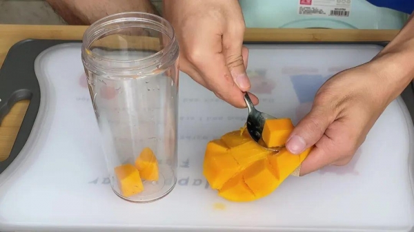 5、再把果肉放入榨汁机中,根据个人口味放入白糖,再加入牛奶淹没芒果,然后盖子盖上,把它打成芒果汁。