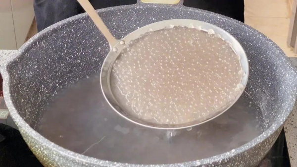 3、然后把西米盛出来,放入凉白开里面过一下水,这样西米会更加清爽Q弹一些。