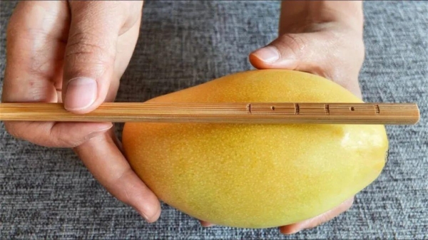 4、现在我们切一个芒果,先竖着刮两刀,然后再横着刮三刀,再把它翻过来,用一个勺子把果肉刮出来。