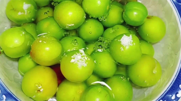 1、准备2斤李子,先加入一勺食盐、一勺小苏打,再往里面加入清水,清水的量一定要没过梨子,浸泡10分钟左右。