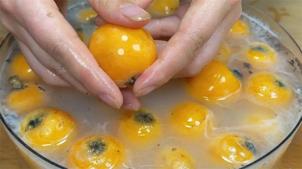 2、然后在枇杷上划两刀,再剥掉果皮,掰开果肉,扔掉果核,把果肉放入水中,防止氧化变黑,再把果肉清洗干净。