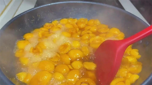 8、然后倒入洗好的枇杷肉,加入冰糖,先开大火把汁水煮开,煮开后用铲子轻轻推动,再转成中火熬煮40分钟。