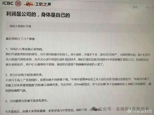 无独有偶,近日在工商银行内部的论坛"工软之声"上,一位员工的帖子引发了广泛热议。