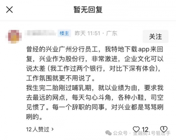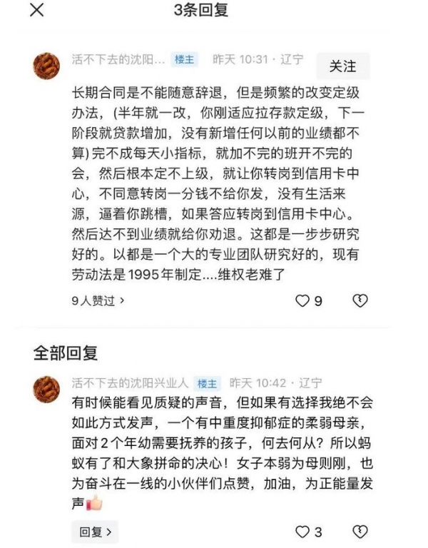 该网友自称是兴业银行沈阳分行的一线员工,从24岁入职至今已经在兴业银行奋斗了16年。
