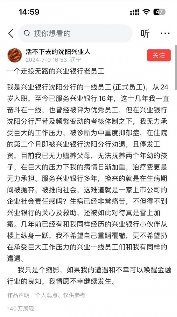 近日,一位昵称为"活不下去的沈阳兴业人"的网友以《一个走投无路的兴业银行老员工》为题,在网上发帖称自己遭受了兴业银行沈阳分行的不公对待。