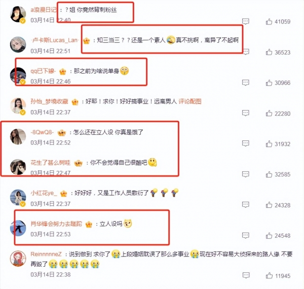 随便翻一下"让他滚了"这四个字的下方评论,被点赞最多的是"姐,你竟然被刺粉丝",排在第二的是"知三当三?还是一个素人,真不挑啊,离异了了不起啊",下面是质问她的内容"那之前为啥说单身",再往下翻,基本都是不能认可她的态度、质问她的内容,比如"怎么还在立人设,你真是饿了"、"你不会觉得自己很酷吧"。