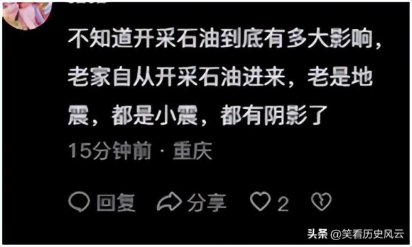也有网友说:不知道开采石油到底有多大影响,老家自从开采石油进来,老是地震,都是小震,都有阴影了。