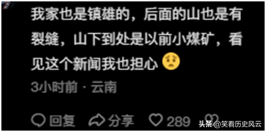 有网友听了担忧的说:我家也是镇雄的,后面的山也是有裂缝,山下到处是以前小煤矿,看见这个新闻我也担心。