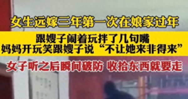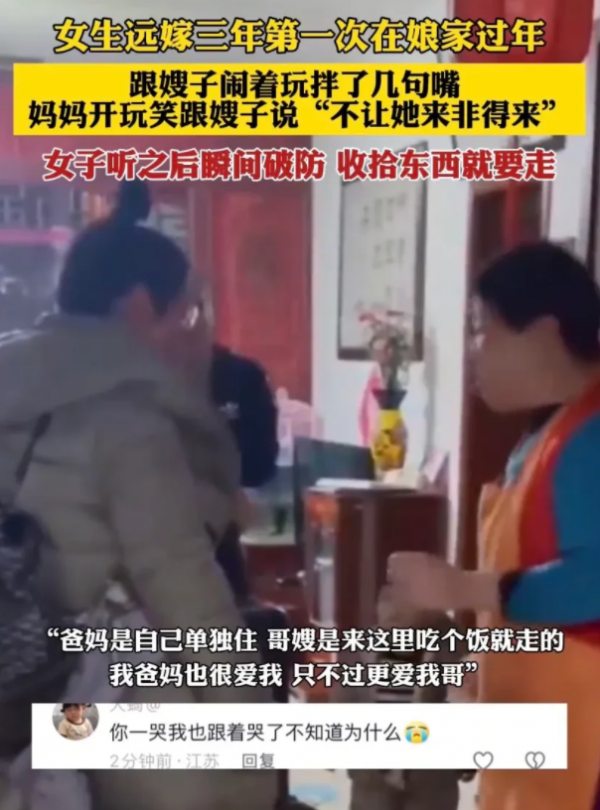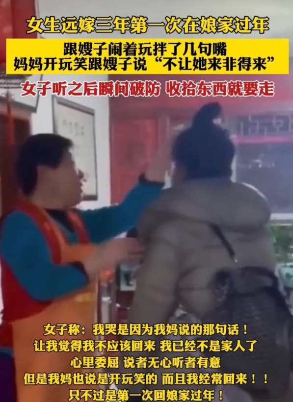 在中国传统文化中,女子出嫁后,婆家便成为她的新家,但娘家永远有着特殊的地位。这位女子三年来一直在婆家过年,今年终于能回到了久违的娘家,本应是一件喜悦的事情。然而,一句"不让她来她非得来",虽是开玩笑的话,却无意中触碰了她的敏感神经,让她感受到了被排斥和不被理解的痛苦。