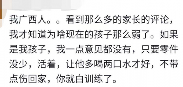 值得注意的是,不同地区的网友对此事的看法也存在差异。广西地区的部分网友较为支持这种训练方式,他们认为这种训练有助于孩子的成长,能够培养他们的坚韧意志和抗压能力。在广西,传统的军训和严格的教育方式较为普遍,许多家长认为"吃得苦中苦,方为人上人"。