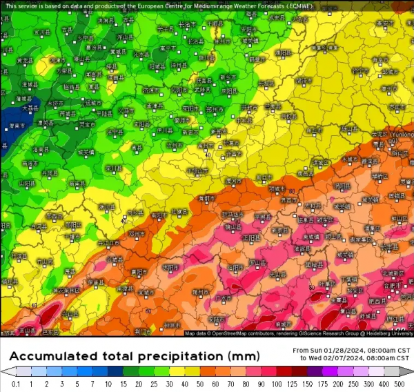 洛阳、南阳、信阳、驻马店等城市降水条件较好,预计过程累计降水量可达80-120毫米,属极端暴雪标准。省内其他大部分地区,黄河以北累计降水在20-30毫米;黄河以南为30-50毫米,局部可超过60毫米。一般来说,1毫米降水约可折合成0.7厘米雪水当量。所以本轮过程中,大部分地区的积雪深度可达20厘米以上,属暴雪或大暴雪标准。