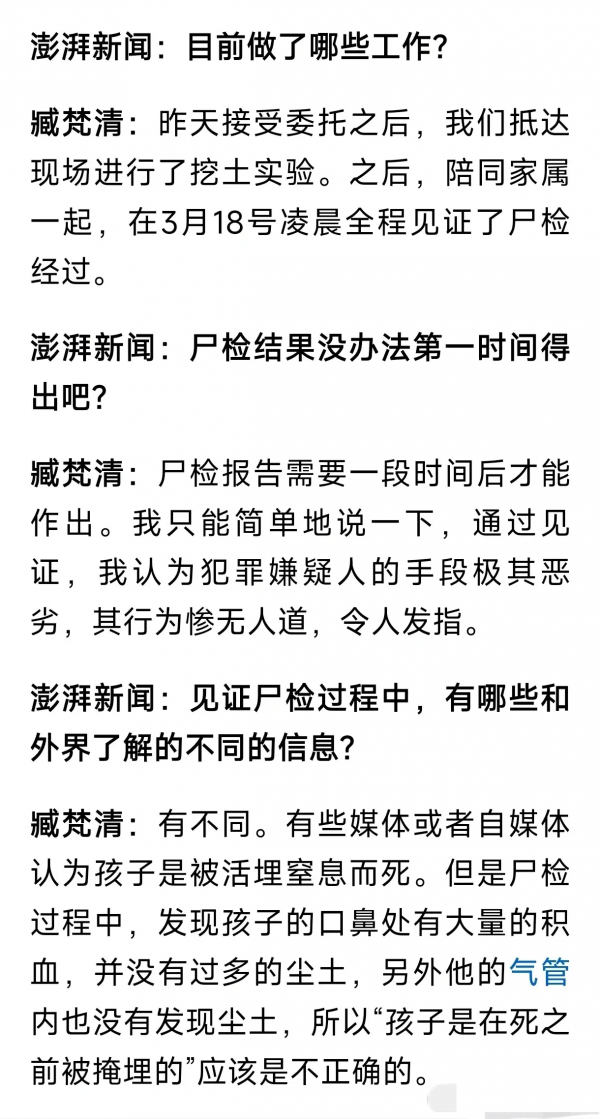 2:孩子口鼻处有大量的积血,并没有过多的尘土,另外气管内也没有发现尘土,所以外界说孩子是在死之前被掩埋的,应该是不正确的!孩子头部背部被尖锐物体打击,脖子部位也有!可以想象,孩子生前应该是被三个人拿着铁锹围住狠狠打了很久!