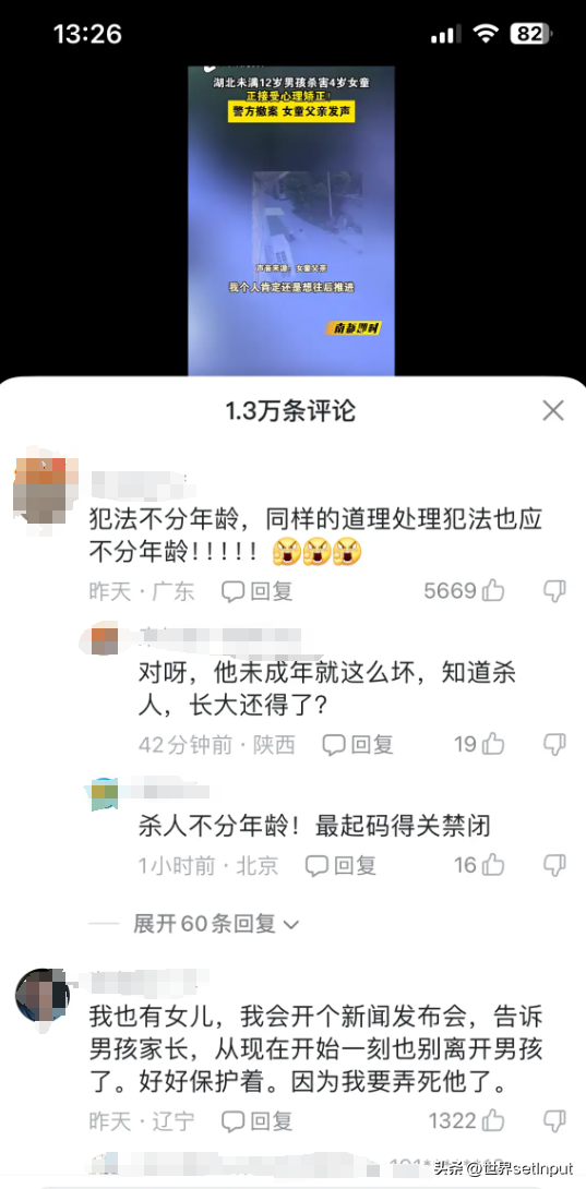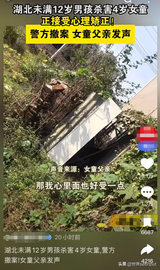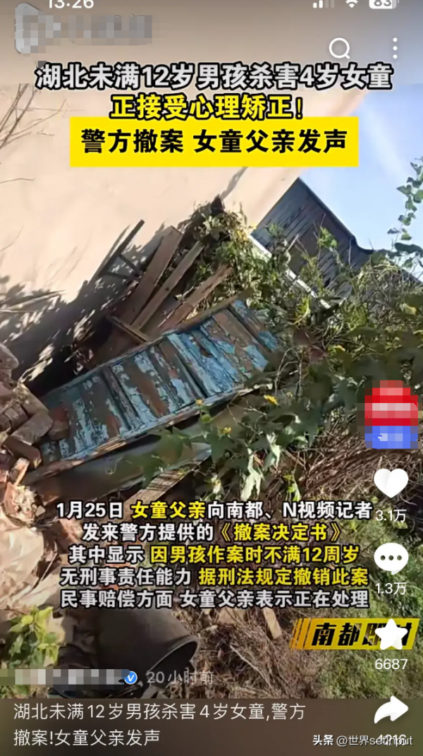 近日,湖北荆州公安县未满12周岁男孩杀害4岁半女童一事冲上热搜,引发众多网友关注。