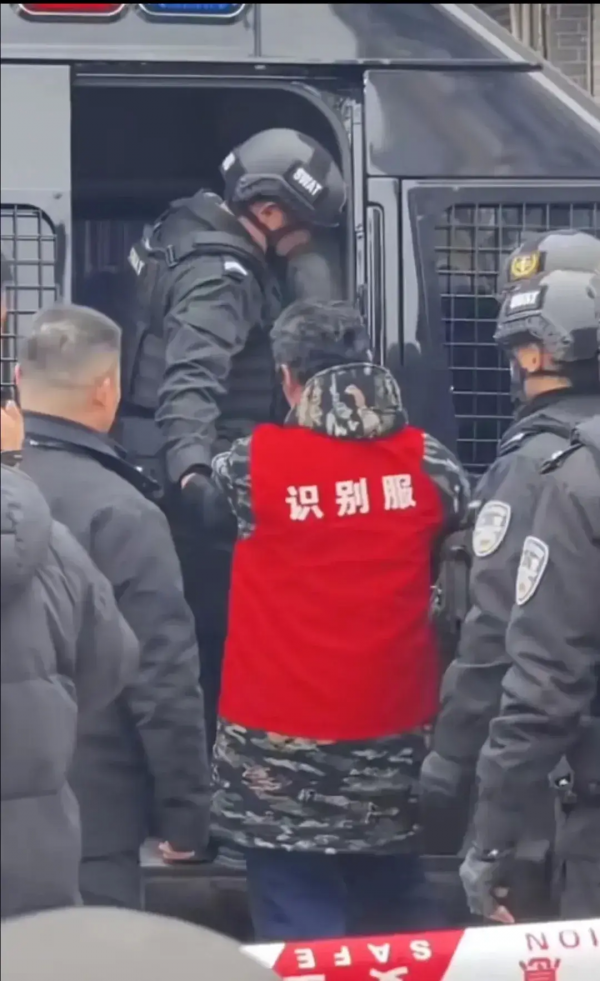 李小龙穿着红马甲、戴着手铐脚镣被荷枪实弹的特警押着走下警车,来到作案现场指认,数十名民警在周边维持秩序。