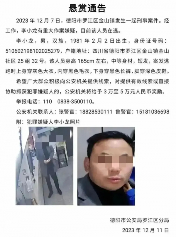 李小龙杀妻后一直潜逃,直到12月14日,才在绵阳市永兴镇发现了他的踪迹,为了生存,李小龙不得不去超市买食品作为生活用餐,他哪里想到会被服务员认出后报警。