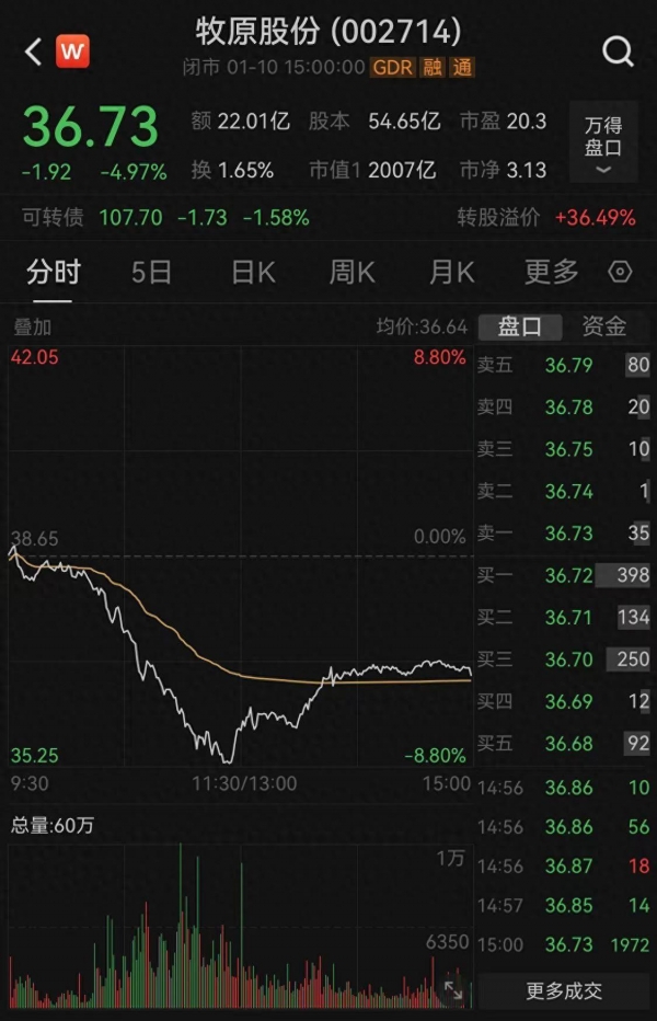 1月10日,被称为"猪茅"的龙头猪企牧原股份(002714.SZ)股价大跌,盘中一度跌逾8%,收报36.73元/股,跌幅达4.97%。