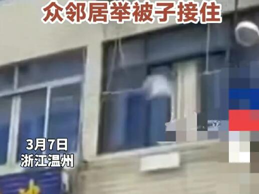 楼下的邻居们纷纷伸出援手,不顾个人安危,用被子接住孩子,为孩子筑起了一道生命的防护墙。