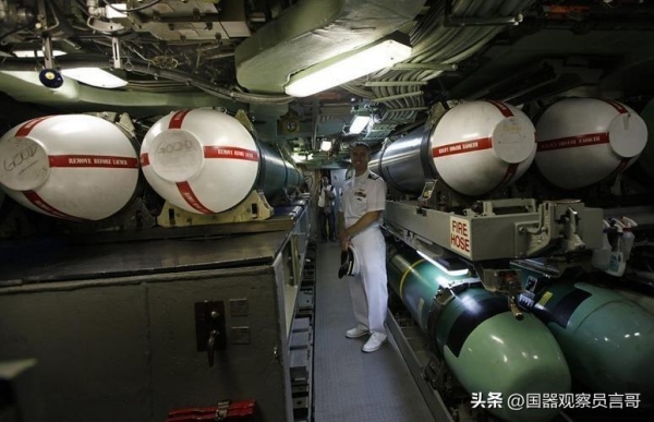 MK48型中533毫米口径的重型鱼雷,是美国海军的主力鱼雷,内置的弹药量达到了300公斤,发射出去以后能达到55节的航速,下潜深度足足有900米,可以应付各种地形。而且作为一种双平面鱼雷,不管是水平维度还是垂直维度,都能自动寻找目标并进行打击。相对于曾经只能固定深度进行打击的单平面鱼雷来说,既能反舰又能反潜。