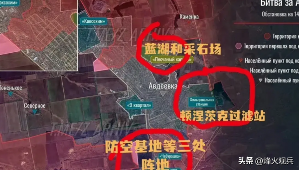 俄军凭借大规模的炮火轰炸和压倒性的兵力优势(阿夫迪夫卡俄军至少有四万人),已经在阿夫迪夫卡周边区域取得了相当大的进展。乌克兰方面原本苦心经营许久的阿夫迪夫卡三座加固防御的规模较大的要塞攻势已经在2月15日一夜间全部失守!这也是俄军近期在阿夫迪夫卡取得的较大的一次胜利。据称,这三座要塞化的防御工事分别是位于阿夫迪夫卡北部高速公路路口处的名为"切布拉什卡"防御阵地,另外还有两处是"切布拉什卡"要塞和其北部的"维诺格拉德尼"要塞。从现场公开的画面上看,参与进攻这些要塞的部队,除了俄军正规军之外,还有大名鼎鼎的车臣武装部队,这些车臣武装已经在阿夫迪夫卡原乌军要塞区飘扬起了车臣的红绿相间的旗帜。这三座屏障阿夫迪夫卡的要塞在一夜之间迅速丢失,已经使得阿夫迪夫卡北部门户洞开,阿夫迪夫卡局势已经是危如累卵。