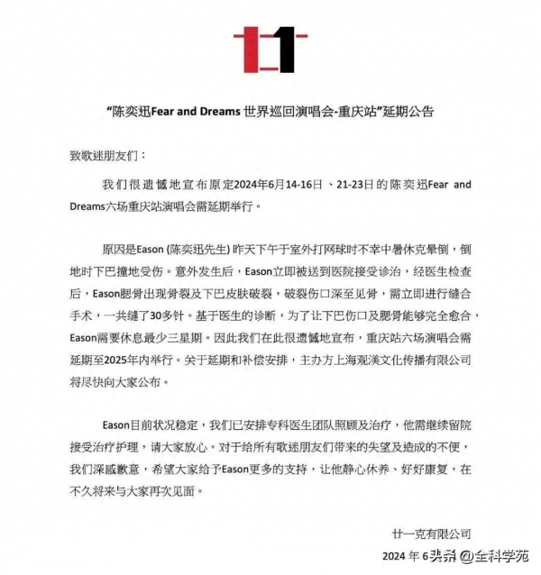 6月11日,一则消息突然冲上热搜,@陈奕迅FearAndDreams巡回演唱会 发布关于演唱会重庆站延期的公告。