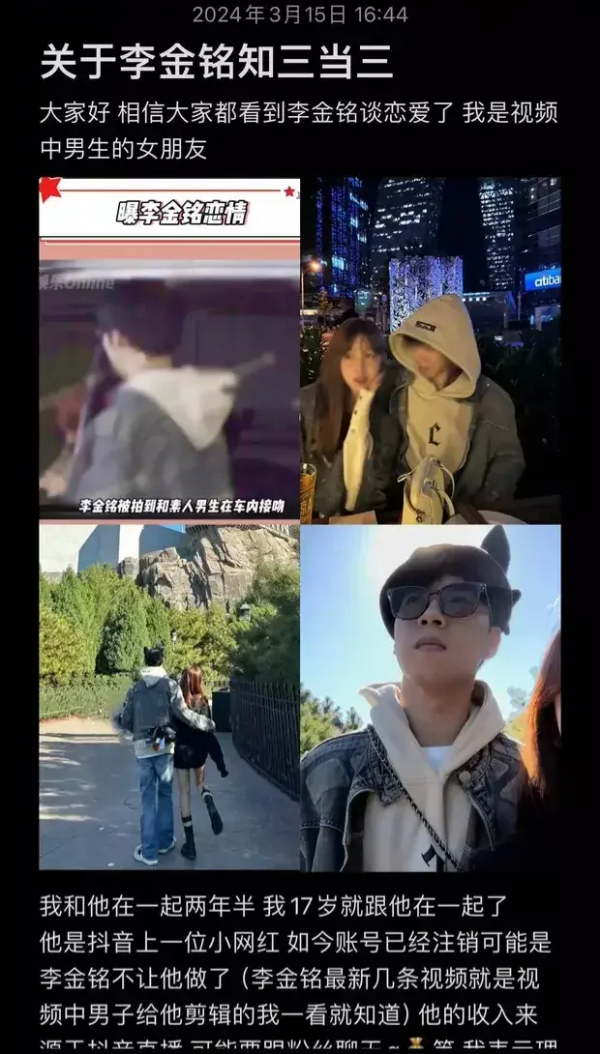 然而,就在这段恋情曝光后不久,一名网友突然站出来发声,自称是该男子的女友,并表示两人已经交往了两年半。该网友称,自己17岁就与这名男子在一起,感情深厚。她还透露,李金铭是通过看男子直播时加上的,而且在明知男子有女友的情况下,仍然选择了与其交往,疑似知三当三。