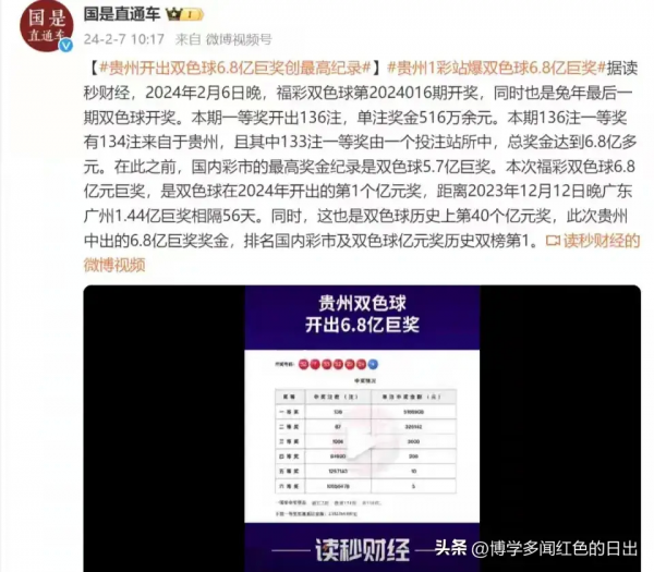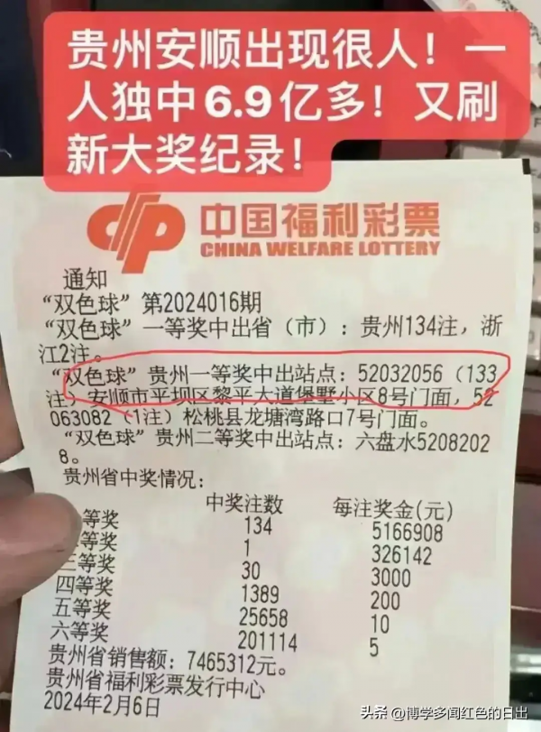 在2024年2月6日晚,福彩双色球迎来了兔年的最后一期开奖盛宴,第2024016期的开奖结果令全国彩民瞩目。本期一等奖共开出136注,单注奖金高达516万余元,创造了近年来的新高。令人震惊的是,这136注一等奖中有134注落在了贵州,其中133注更是被同一个投注站所中,总奖金高达6.8亿多元,这一壮举无疑刷新了双色球的历史纪录。