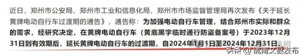 作为较早响应新国标政策的郑州市,早在2022年1月就实施了延长两年的过渡期,到2023年12月31日截止,日前又有好消息传来,相关部门经研究决定后,再次将郑州市的黄牌超标电动车过渡期延长一年,使用截至2024年12月31日。