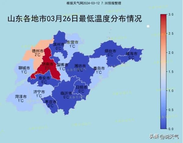 当然,后续的冷空气降温还是很猛的!预计26日,山东多地的最低气温又将回到冰点附近,其中,滨州,潍坊,泰安,烟台,威海,日照,临沂,枣庄将再度回到0度了!