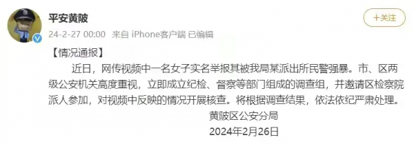 27日凌晨0点0分,黄陂区公安分局发布情况通报,称已关注到网传一女子举报被黄陂区公安分局某派出所民警强暴一事,已成立由纪检、督查等部门组成的调查组,并邀请检察院派人参加,将根据调查结果,依法依纪严肃处理。