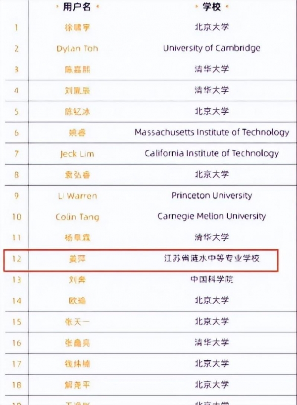姜萍不仅仅在整体排名中位列第12位,还是在前30名选手中唯一的女生。