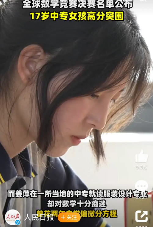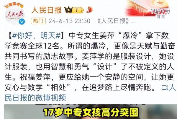 6月13日晚,人民日报官方微博也转载了姜萍的事迹,并以《你好,明天》为题发表了评论:中专女生姜萍"爆冷"拿下数学竞赛全球12名。