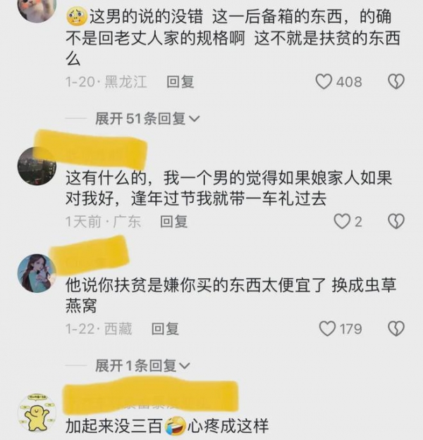甚至还有网友说,这男人说的没错,那一后备箱的东西,的确不够会老丈人家的规格,这不就是扶贫的东西吗?我要是老丈人,你们最好别回来,难帮你煮饭,难帮你洗碗。