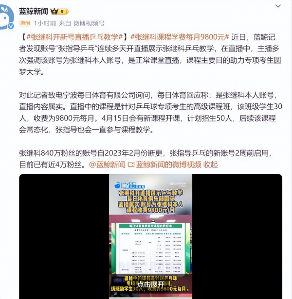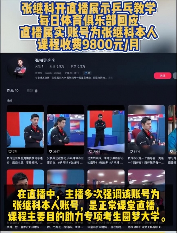 根据记者致电宁波每日体育有限公司询问,对方回应是张继科本人账号,并且直播内容属实。至于张继科直播教学的课程,范围是针对乒乓球专项考生的高级课程班,而该班级拥有学生30人,收费为9800元每月。