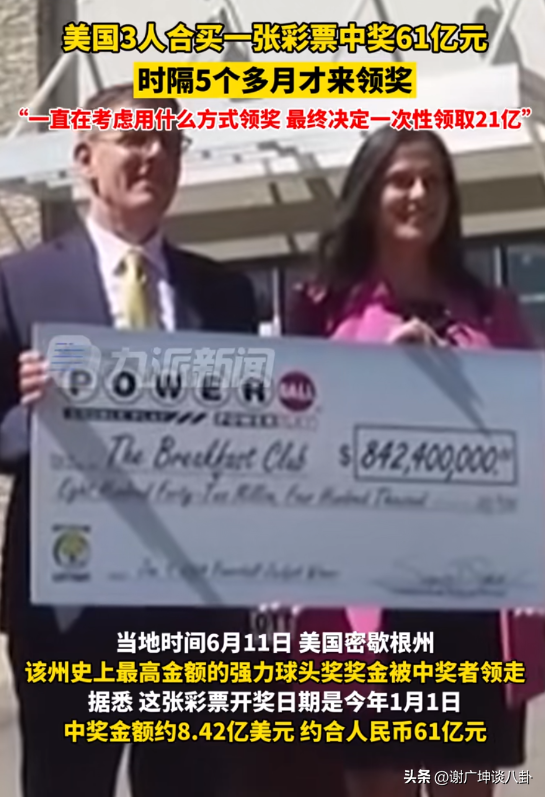 这张彩票的开奖日期是今年1月1日,中奖金额约8.42亿美元,约合人民币61亿元。