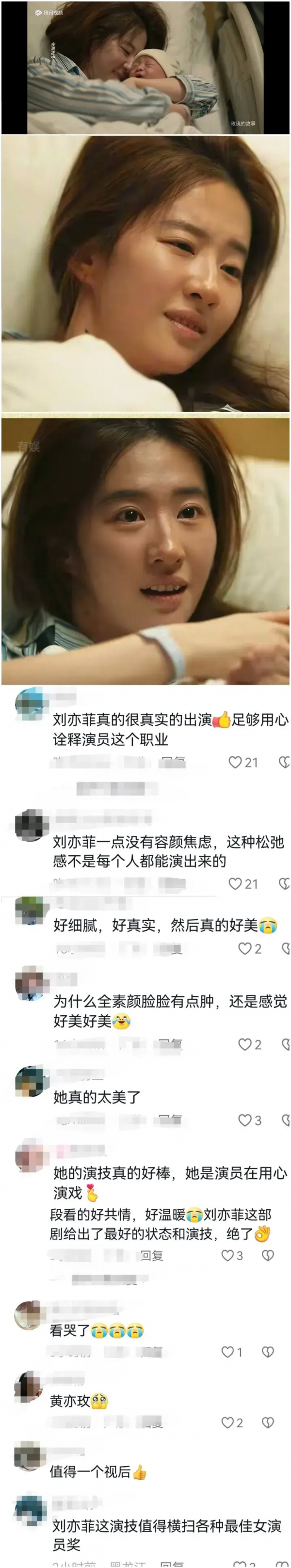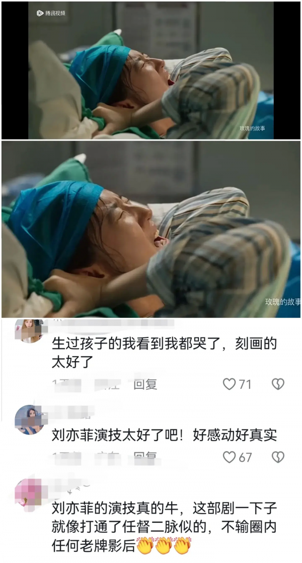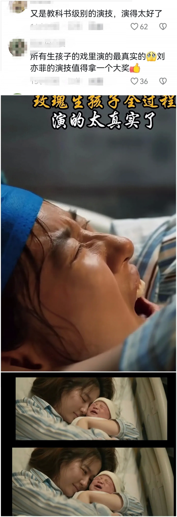 这段戏刘亦菲全素颜出镜,完全没有偶像包袱,从怀孕到生产,太真实了,完全不像在演戏,作为未婚未育的刘亦菲来说,能把生孩子这种戏演得那么真实,代入感好强大,让屏幕前曾有生产经历的人感同身受,她的演技好到让人激动得忍不住流泪,简直堪称教科书式的演绎了