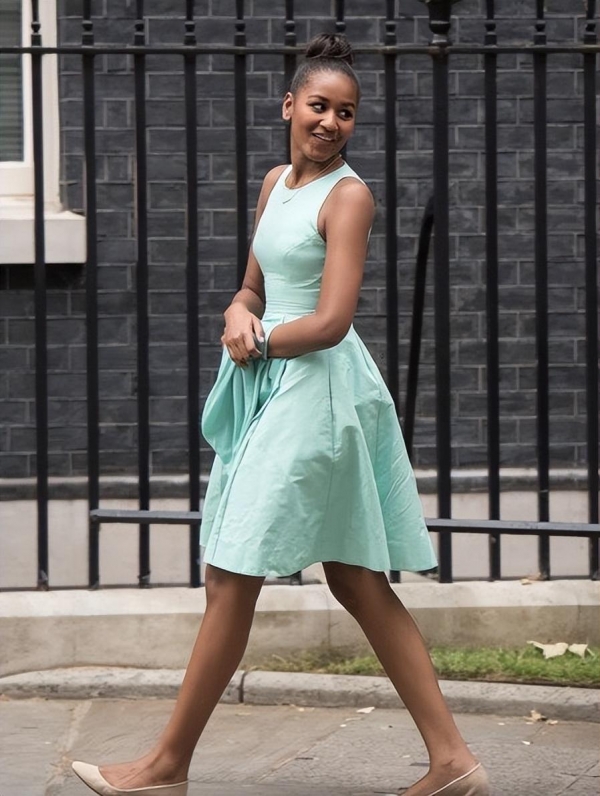一家人合照的时候,萨沙将头发盘成漂亮的黑色发髻,看起来又漂亮又淑女,和父亲奥巴马一起同框卖萌,父亲在她的后脑勺比出"兔耳朵"的姿势,而她则是俏皮地嘟着嘴,对着镜头做出飞吻。