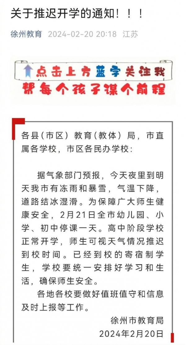 为保障广大师生健康安全,2月21日徐州市幼儿园、小学、初中停课一天。高中阶段学校正常开学,师生可视天气情况推迟到校时间。已经到校的寄宿制学生,学校要统一安排好学习和生活,确保师生安全。各地各校要做好值班值守和信息及时上报等工作。