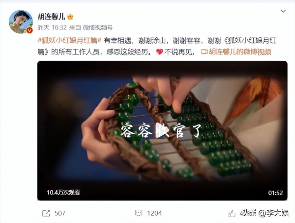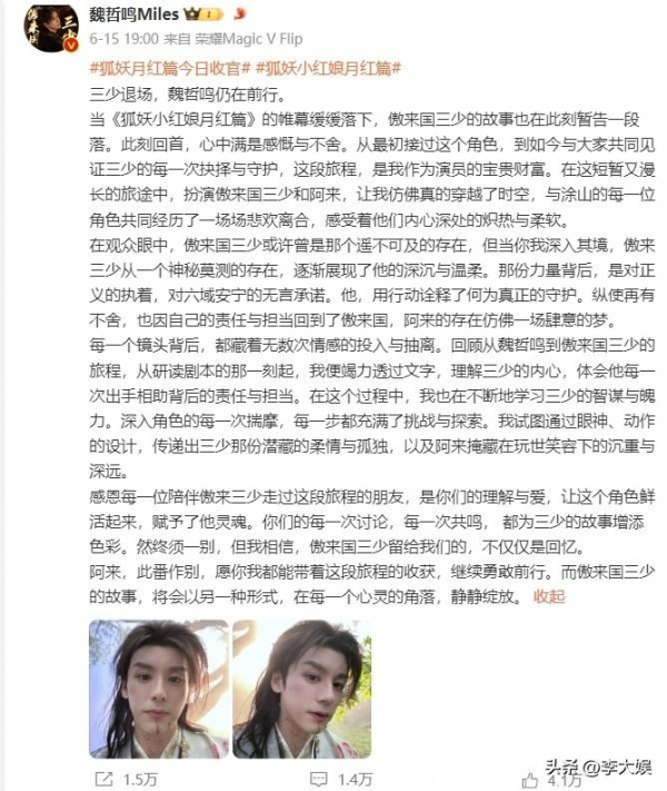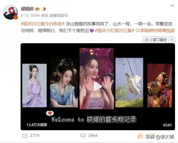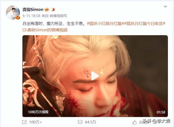 确实,现在每部剧大结局,主演甚至是配角都会发文,一方面告别角色,另一方面告别剧粉,《狐妖》虽然播得不好,但是在播期间龚俊以及其粉丝积极宣传,就连魏哲鸣和郭晓婷也是各种刷楼为《狐妖》加热,唯独杨幂在剧组拍戏,就连宣传综艺《你好星期六》都没有参加。