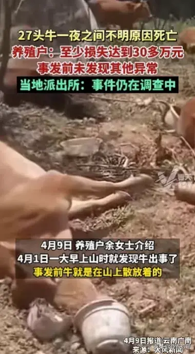 云南一位养殖户,最近损失惨重,因为她家的20多头牛,一夜之间离奇死亡了。